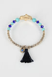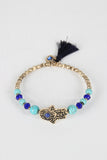 This bracelet features a beaded wire design, hamsa charm, with a tassel and charm detail and open ended for easy on/off.