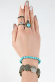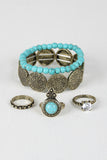 This set features elasticized Southwestern pattern embossed concho bracelet, cracked turquoise bead bracelet, cracked turquoise stone ring, large rhinestone ring, and round studded ring.