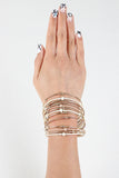 This cuff bracelet features a multi colored loose wires, faux stacked bracelet design, metal beads and wire wrapping details. Open ends for easy on/off.