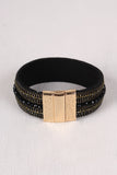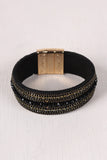 This stylish bracelet features a vegan suede band, chain and rhinestone embellishments, and a high polished gold tone metal magnetic closure.