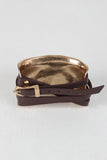 This cuff bracelet features a wrap design, with vegan leather straps, metal half cuff with upturned edges, and an adjustable buckle closure.