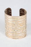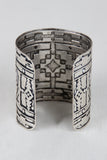This Aztec inspired cuff features a embossed metal design, painted outlines to emphasize the pattern and open ended for easy on/off.