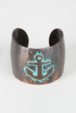 This cuff bracelet features a hammered metal design, faux oxidized detailing, a raised anchor design, Open ended for easy on/off.