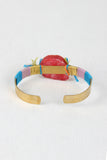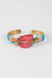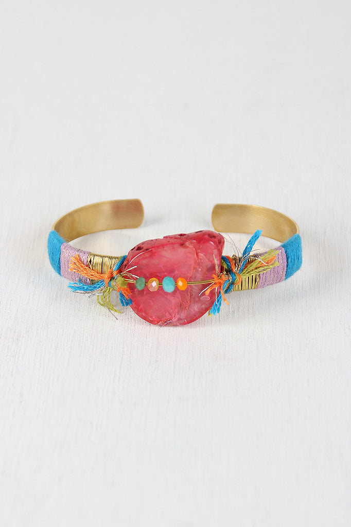 This artsy bracelet features a open metal cuff design, colorful thread wrapped detail, stone bead with smaller bead details. Open ended for easy on/off.