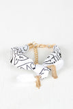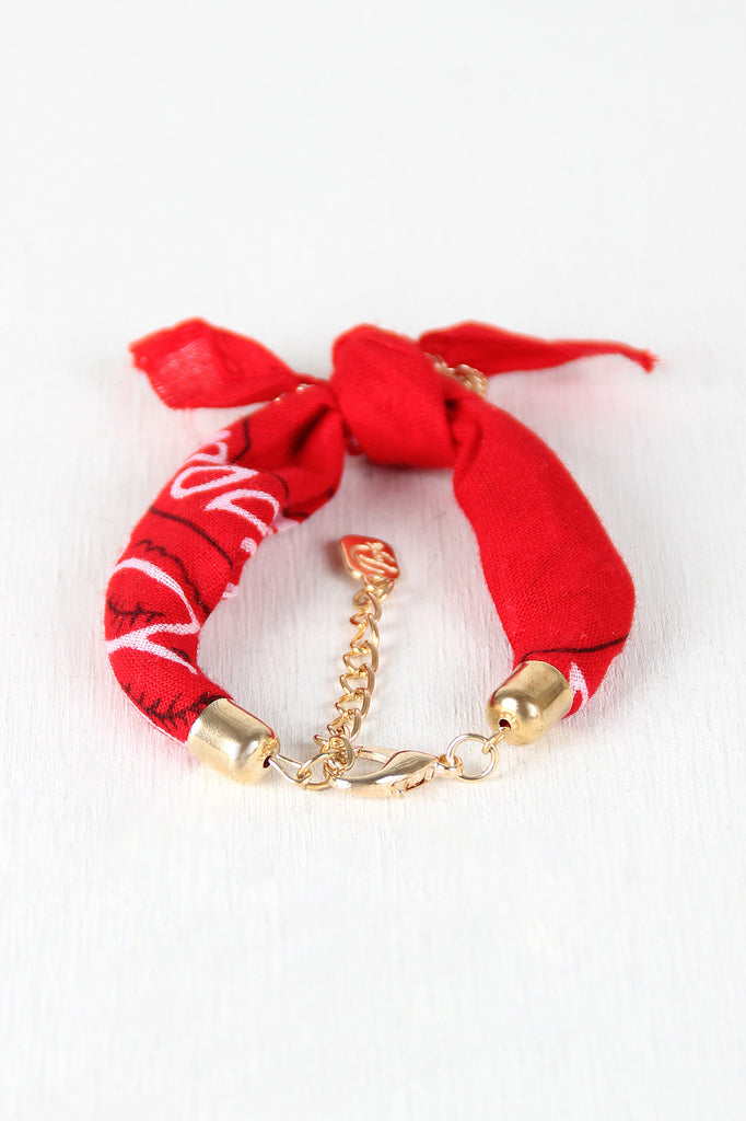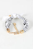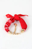 This bracelet features a knotted fabric bandana design, with chain tassels and an adjustable lobster claw closure.