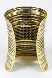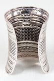 This trendy bracelet features a polished metal frame, brick etched pattern, curved construction, and easy on/off cuff fit.