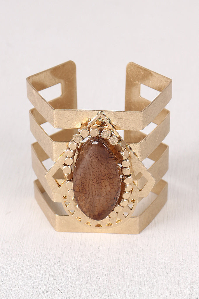 This cuff features a brushed metallic finish, angular caged design, with a decorative arrow and stone detail attached to top. Open ended for easy on/off.