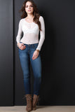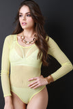 This bodysuit features a semi-sheer mesh fabrication with vertical ribbed texture, round neckline, long sleeves, brief bottom, and double snap button closure. Accessories sold separately. Made in U.S.A. 94% Polyester, 6% Spandex.