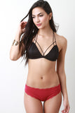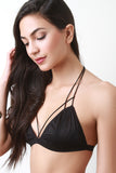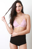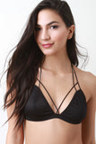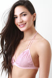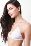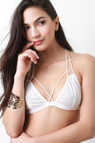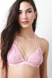 This bralette top features a semi-sheer triangle mesh design, strappy caged straps, and an elasticized band racer back. Accessories sold separately. 90% Viscose, 10% Spandex.