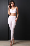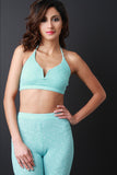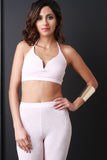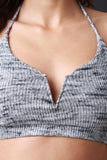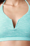 This sporty crop top features halter straps a v cut neckline with a metal structure piece to keep the shape, elastic band hem, lined front, rib knit fabrication. Accessories sold separately, Made in U.S.A. 95% Polyester. 5% Spandex.