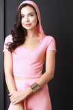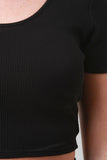 This top features a thermal knit fabrication round neck with a hoodie back, short sleeves, and a crop hemline. Accessories sold separately. Made in U.S.A. 95% Rayon, 5% Spandex.