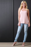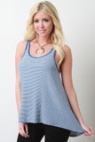 This top features stripe design, ribbed knit fabrication, scoop neckline, double thin straps, and sleeveless construction. Finished with a high low hemline. Accessories sold separately. Made in U.S.A. 47% Polyester, 47% Rayon, 6% Spandex.