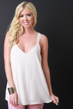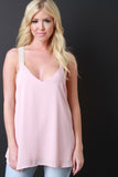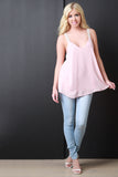 This top features a v-neckline, crochet detail lace strap, flowy semi-sheer fabrication, and hanging open back. Finished with an underlay. Accessories sold separately. Made in U.S.A. 100% Polyester.