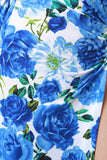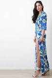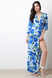 This alluring dress features floral print, surplice front, long bishop sleeves, high side slit, and maxi length. Accessories sold separately. Made in U.S.A. 95% Polyester, 5% Spandex.
