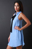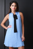 This cute dress features a sleeveless design, high neckline with ruffle collar, contrast neck ties, keyhole opening, A-line silhouette, finished with a full lining. Accessories sold separately. Made in U.S.A. Self: 65% Rayon, 35% Polyester. Lining: 100% Polyester.