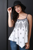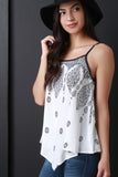 This cute top features a sleeveless design, spaghetti straps, contrast bias tape, an engineered floral design, with a flowy square shaped hemline. Accessories sold separately. 100% Rayon