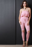 This crop top features jersey knit, tiered ruffle design, and strapless construction. Accessories sold separately. Made in U.S.A. 100% Rayon.