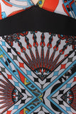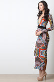 This bold maxi dress features a colorful abstract print, semi sheer mesh fabrication, contrast empire waist band, slim fit silhouette, long sleeves and a deep v neckline. Accessories sold separately. Made in U.S.A. 100% Polyester.