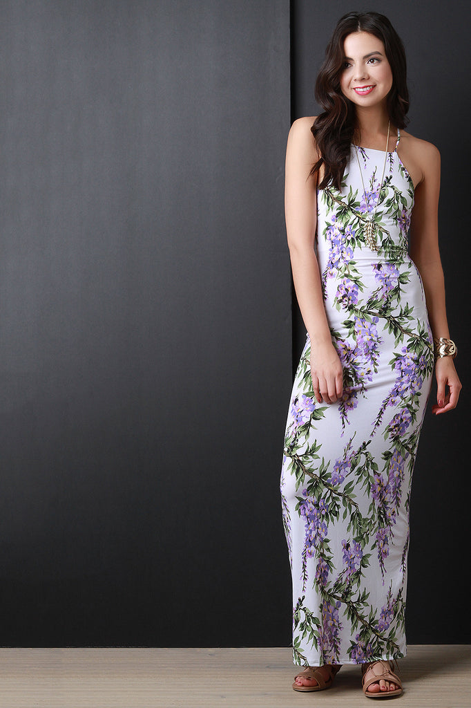 This maxi dress features a square apron neckline, curve hugging bodycon fit, self tie lace up spaghetti straps, open back, knit fabrication, finished with a floral print pattern. Accessories sold separately. Made in U.S.A. Self: 96% Polyester, 4% Spandex. Lining: 100% Polyester.