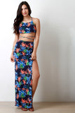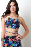 This open back top features a smooth stretchy knit fabrication, tropical print design, halter neck, shoulder straps cross front to a back tie end, and cropped hemline. Accessories sold separately. Made in U.S.A. 95% Polyester, 5% Spandex.