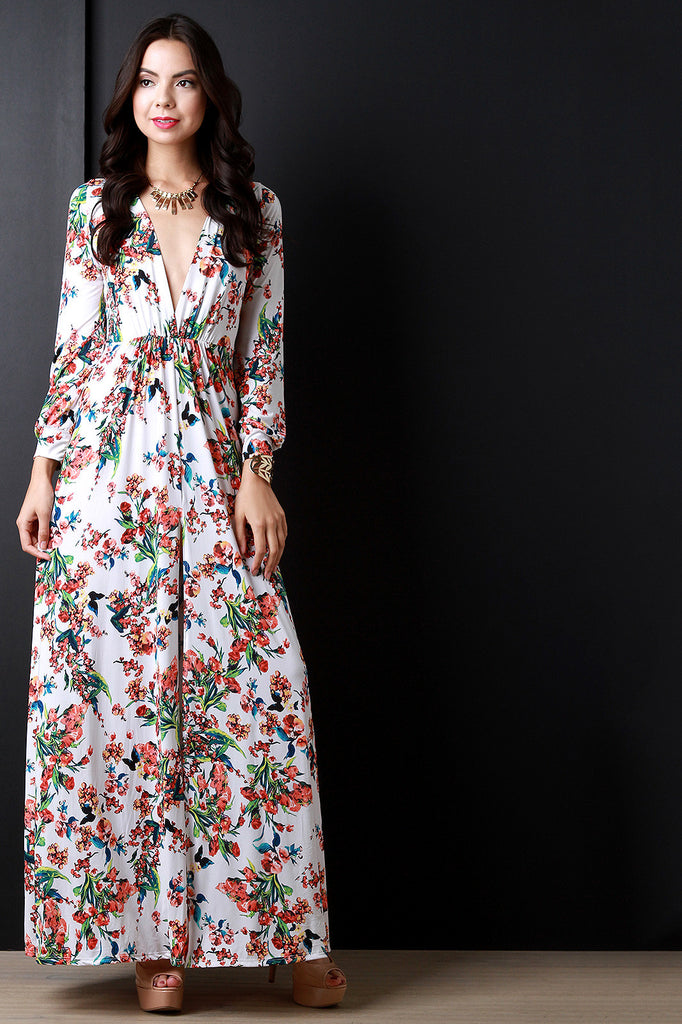 This beautiful dress features a smooth stretchy knit fabrication, blooming flowers print design, plunging v-neckline, and cuffed longsleeves. Finished with an elasticized high waist fit, and front high slit. Accessories sold separately. Made in U.S.A. 95% Polyester, 5% Spandex.
