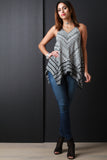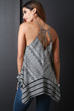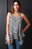 This sleeveless top features a v-neckline, strappy caged racer back, trapeze fit, handkerchief hemline, and tribal pattern print. Accessories sold separately. Made in U.S.A. 100% Cotton.