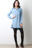 This chambray top features button-up front to a classic collar neckline, long sleeves with button tab cuff option, flap breast pockets, and a shirt tail hemline. Accessories sold separately. 100% Lyocell.