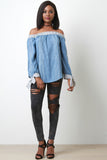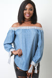 This off the shoulder top features a wide elasticized bardot neckline, relax cut fit, long sleeves, and vertical stripe prints. Accessories sold separately. Made in U.S.A. 100% Cotton.