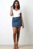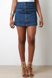 This denim jean skirt features a high rise design, zip up front, square front pockets, and slight flare cut. Accessories sold separately. 100% Cotton.