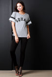 This awesome t-shirt features a jersey knit fabrication with "SQUAD" graphic printed at front, round neckline and stripe-detailed short sleeves. Finished with a rounded hemline. Accessories sold separately. 95% Rayon, 5% Spandex.