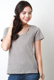 This not-so-casual t-shirt features a marled jersey knit fabrication, v neckline, holes and distressed design, and short sleeves construction with a high low hemline. Accessories sold separately. Made in U.S.A. 100% Cotton.
