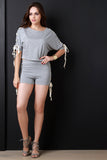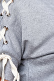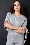 This stylish top features a jersey knit fabrication, dolman sleeves with eyelet lace-up detail, boat neckline, and cropped hemline. Accessories sold separately. 77.5% Rayon, 4.5% Spandex, 18% Polyester.