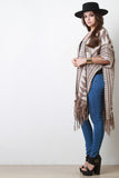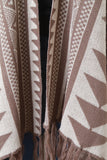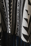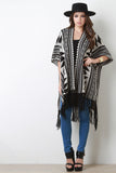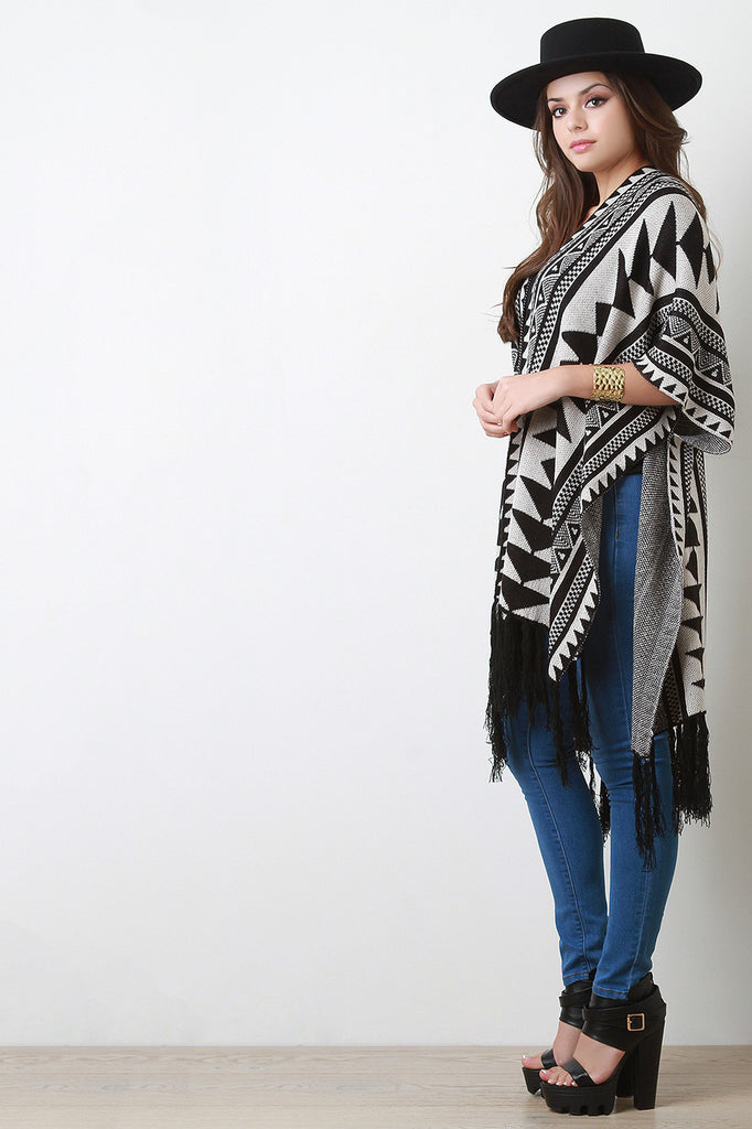 This tribal inspired poncho features a knit fabrication, two tone tribal print, open front design, open sides and a tassel fringe hem. Accessories sold separately. 100% Acrylic.