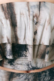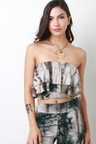 This sleeveless top features an elasticized tube neckline, double flutter tier, crop hemline, and tie dye print on jersey knit fabrication. Accessories sold separately. Made in U.S.A. 96% Rayon, 4% Spandex.