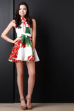 This beautiful mini dress features a scuba knit fabric printed with bold roses throughout, front and back keyhole, mock neckline, and sleeveless fit. Finished with a flared ruffle skirt and double hook button closure at nape. Accessories sold separately. Made in U.S.A. 95% Polyester, 5% Spandex.