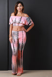 This crop top features an elasticized off-the-shoulder ruffled neckline, soft jersey knit with tie dye coloring, and a cropped hemline. Accessories sold separately. Made in U.S.A. 96% Rayon, 4% Spandex.