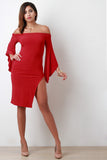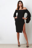 This alluring dress features a soft stretchy knit, elasticized off the shoulder neckline, asymmetrical bell sleeves design, and side deep slit. Accessories sold separately. Made in U.S.A. 96% Polyester, 4% Spandex.