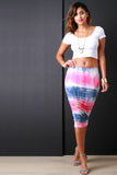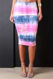 This trendy midi skirt features a jersey knit fabric, acid washed tie dye print design, high waisted fit, elasticized waist band, and pencil cut. Accessories sold separately. Made in U.S.A. 96% Rayon, 4% Spandex.