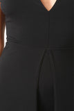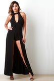This daring dress features a smooth stretchy knit fabric, choker banded with front keyhole, open back with button hook closure at nape, and sleeveless fit. Finished with a boxer shorts underlay and maxi-length hemline with high vent front slit.