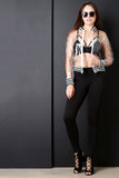 This eye-catching bomber jacket features a transparent lucite material, stripe knit trimming detail, and finished with a front zip-up closure. Accessories sold separately. Made in U.S.A. Self: 100% Polyester. Contrast: 95% Polyester, 5% Spandex.