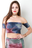 This boho-inspired top features a jersey knit fabric, cloudy tie dye print pattern, off the shoulder neckline, short banded sleeves, and cropped hemline. Accessories sold separately. Made in U.S.A. 95% Rayon, 5% Spandex.