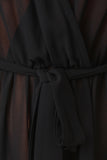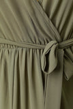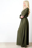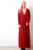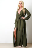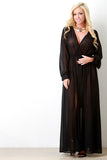 This flowy maxi dress features a lightweight chiffon fabric, surplice neckline, faux wrap construction with self-tie waist sash, cuffed longsleeves, and front high slit. Accessories sold separately. Made in U.S.A. 100% Polyester.