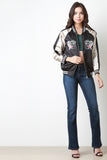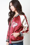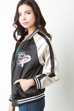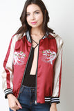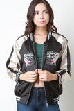 This bomber jacket features two tone glossy charmeuse fabric, striped rib knit trim, zip up front, embroidered koi fish, two pockets, and lining. Accessories sold separately. 100% Polyester.