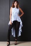 This sleeveless top features a round neckline, high waisted cinched seam, high low hemline, and striped chambray fabrication. Made in U.S.A. 100% Cotton.