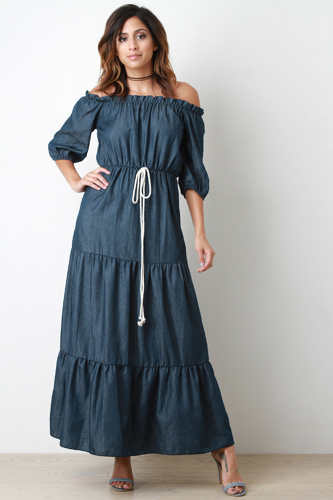 This gorgeous dress features an elasticized off-the-shoulder neckline, three quarter puff sleeves, cinched waist with tie rope accent, and tiered maxi skirt. Accessories sold separately. Made in U.S.A. 100% Cotton.
