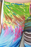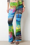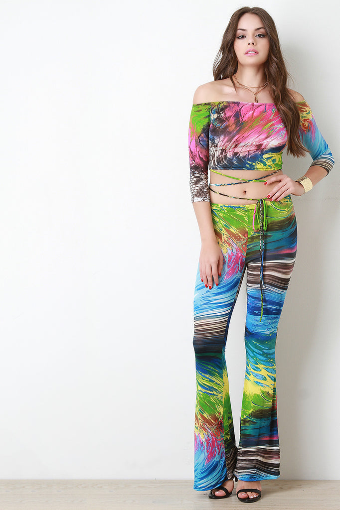 These pants feature smooth stretch fabric, abstract print, elasticized waist, and bell bottoms. Accessories sold separately. Made in USA. 65% Polyester, 35% Rayon.