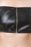 This crop top features a stretch vegan leather fabrication, off the shoulder elastic neckline, elastic sleeves and hem, with an exposed metal separating zipper closure. Accessories sold separately. Made in U.S.A. 92% Polyester, 8% Spandex.