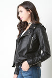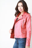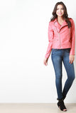 This moto jacket features textured vegan leather, zip-up front, split collar, long sleeves, and zipper accents. Finished with lining. Accessories sold separately. Self: 50% Cotton, 50% Polyurethane. Lining: 100% Polyester.