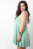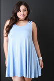 This sleeveless plus size dress features a jersey knit fabrication, boat neckline, relaxed fit, and mini-length hemline. Accessories sold separately. Made in U.S.A. 95% Rayon, 5% Spandex.