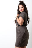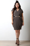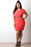 This plus size dress, features a ruched design along sides and shoulders for a fitted form. Short sleeves and v-neckline silhouette. Bottom portion is lined, remainder is unlined. Finished with a detachable belt. Other accessories sold separately. Made in U.S.A. 96% Polyester, 4% Spandex.